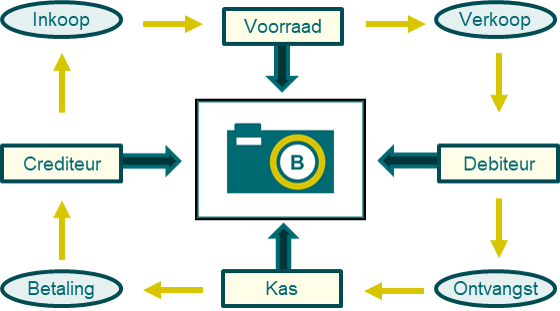 - Een handelsorganisatie: Stel een handelsorganisatie gaat voor € 100 stoelen inkopen. Op het moment van de ontvangst van de stoelen slaan wij deze op in het magazijn. Hierdoor ontstaat zowel een bezitting in de voorraad alsook een schuld richting de leverancier. Omdat er geen realisatie is door middel van de verkoop en ook geen betaling is naar de leverancier, zal door deze activiteit geen vermelding op de Winst en Verlies rekening plaatsvinden en ook geen vermelding op het kasstroom overzicht, we hebben de leverancier immers nog niet betaald. Op het moment dat we de stoelen leveren voor € 120 aan de klant realiseren we een activiteit die we in de Winst en Verlies rekening opnemen. Hierdoor zijn de stoelen echter ook geen bezitting meer van de onderneming en zijn ze dus geen onderdeel meer van de voorraad. Echter heb ik daarvoor in de plaats wel een vordering op mijn klant. Immers hij moet me nog de stoelen in de toekomst nog betalen. Op het moment dat hij dat doet betreft het een geld instroom die in het kasstroom overzicht wordt opgenomen. Op dat moment vervalt mijn vordering op de klant maar heb ik daarvoor in de plaats wel geld in kas. Als ik mijn leverancier vervolgens de rekening van de stoelen ga betalen genereer ik een geld uitstroom (op het kasstroom overzicht) en is mijn kasgeld lager op de balans maar de schuld is ook weg.